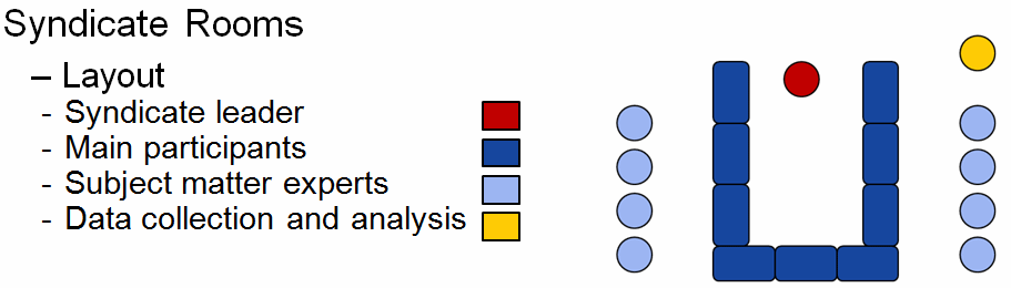 This smaller room should be configured along similar lines to the main room, but at a different scale. About 12 participants can be seated at the tables or desks in the horseshoe pattern, with a syndicate leader acting as facilitator, if one is not available. A space for data collection and analysis should be provided, usually in a front corner of the room where they can observe all of the discourse. An additional 8 to 12 personnel can be accommodated along the walls as advisors to the principals, or as observers.