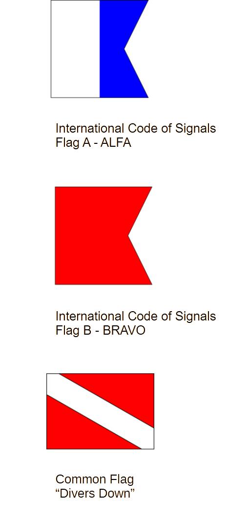 In areas where there are divers in the water, the well-known divers flag may be displayed. This may not be on a vessel and may be flown from a post mounted on a small float. This flag is not part of the COLREGS, but is in common use.